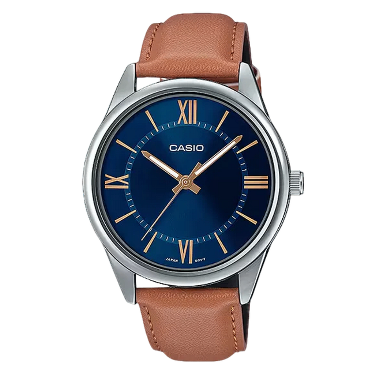 Con un diámetro de 39 mm, su esfera azul profundo y números romanos evocan elegancia atemporal, mientras que la correa de cuero marrón claro aporta un contraste sofisticado que nunca pasa desapercibido. Es el accesorio ideal para cenas, eventos o reuniones donde tu estilo necesita hablar antes que vos.