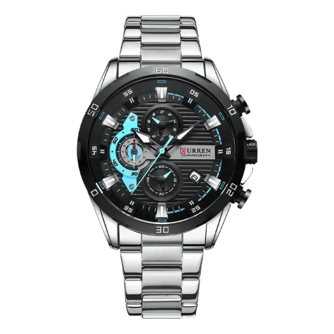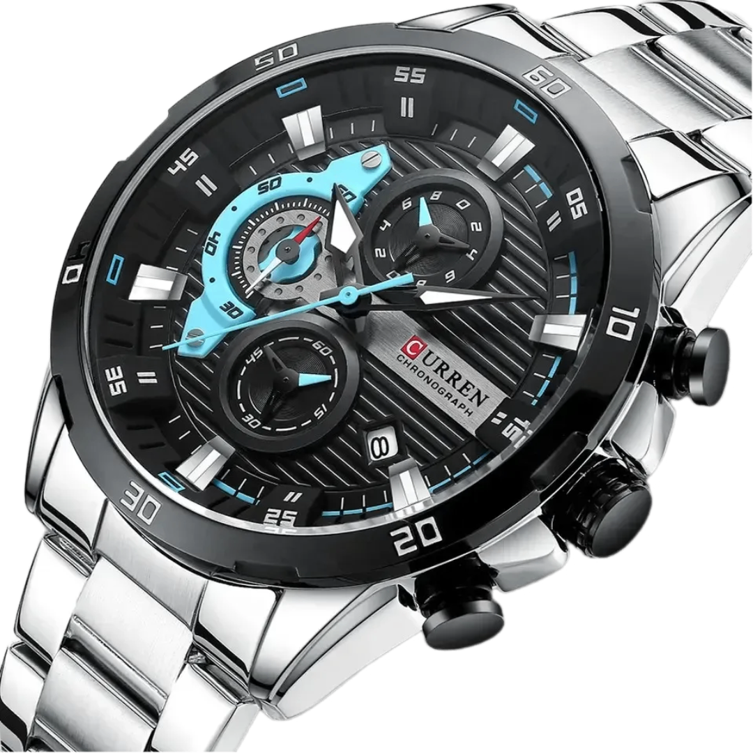 El Vortex Steel es un reloj creado para los hombres que viven a otra velocidad. Su diseño agresivo, con detalles en celeste eléctrico y un cronógrafo imponente, proyecta fuerza, precisión y movimiento constante. No es un reloj para simplemente acompañarte: es un reloj que transforma tu presencia y muestra tu carácter antes de que digas una palabra.